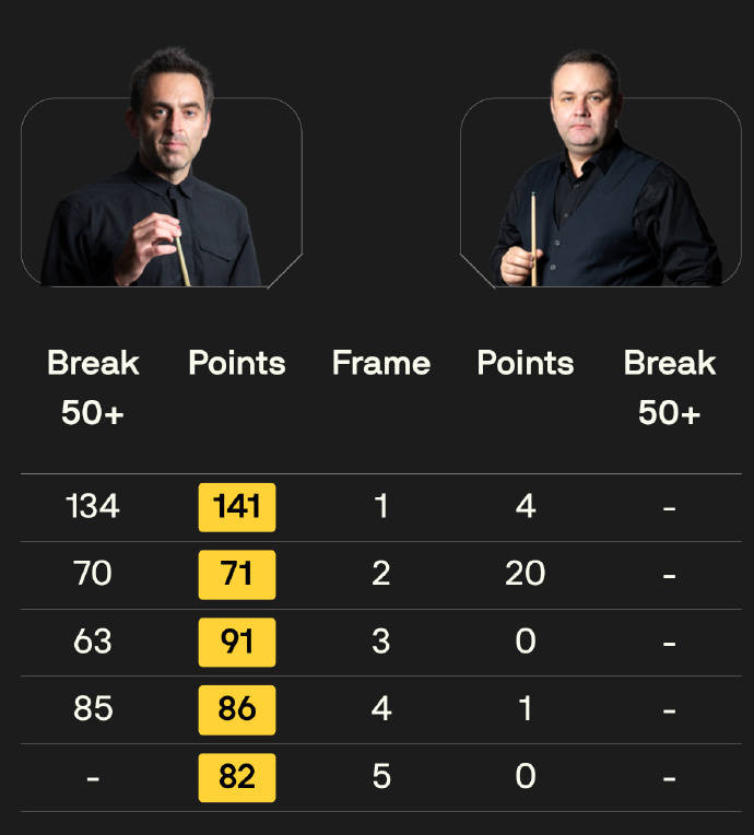 第三局,博伊科的进攻有所提升,但奥沙利文依然能够通过零敲碎打,稳扎稳打,以74-50拿下该局,进一步扩大比分优势,以3-0领先。第四局,奥沙利文的进攻火力全开,他轰出一杆惊艳的单杆112分,以123-54再次获胜,将比分优势进一步扩大到4-0,同时手握四个赛点。